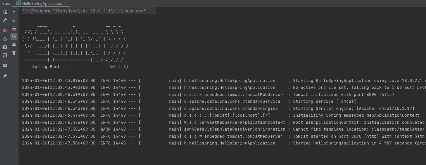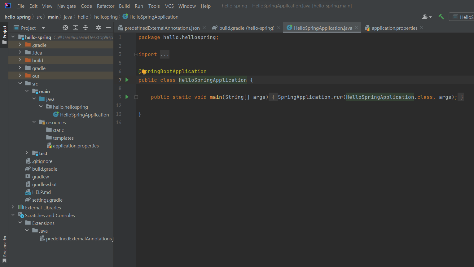 우선, main인 HelloSpringApplication을 Run 시켜본다.