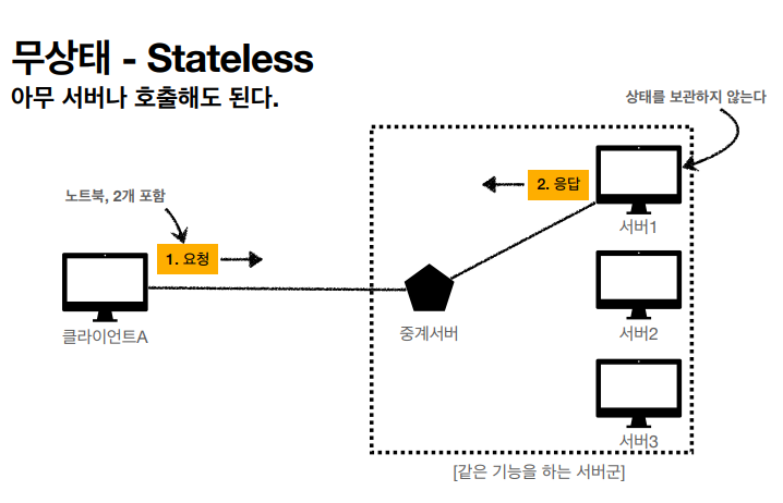 - 서버가 클라이언트의 상태를 보존하지 않는다는 것이다. 이렇게 되면 서버는 당연히 확장성이 높아질 것이다.