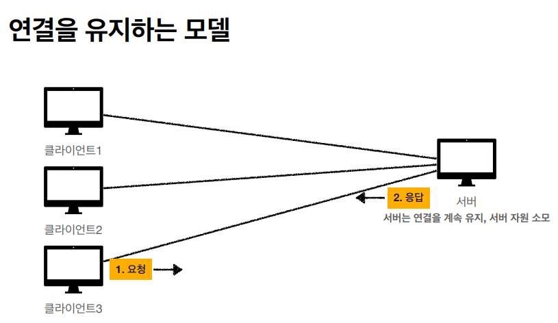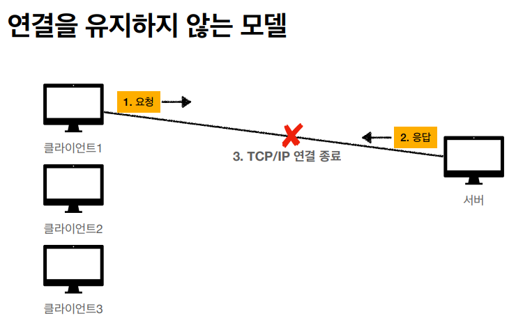 - 매번 TCP/IP 연결을 새로 맺어야 한다. (3way handshake 시간이 또 추가됨)