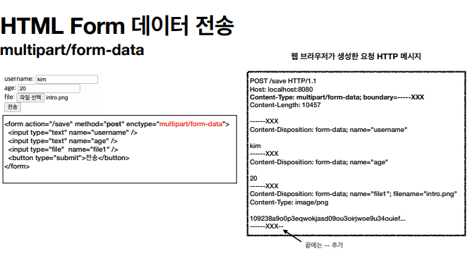 - 다른 종류의 여러 파일과 폼의 내용 함께 전송 가능
