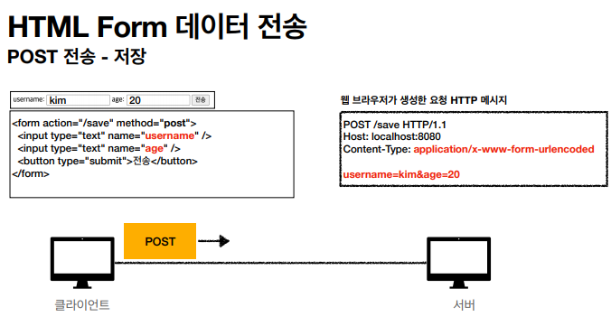 여기서 method는 당연히 POST이다. GET을 써서 /save?username=kim&age=20 이런식으로 HTML Form을 작성해버리면 당연히 리소스가 저장되지 않는다.