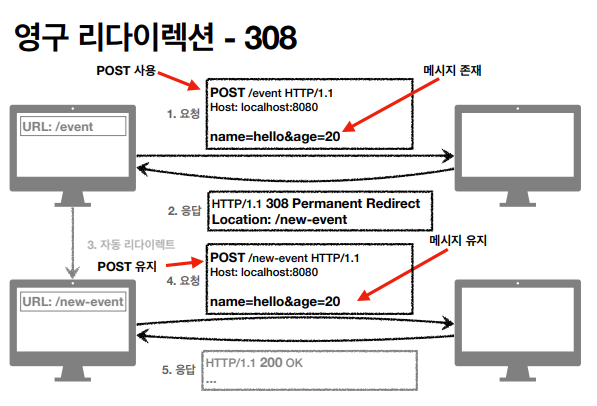 - 308 Permanent Redirect : 301과 기능은 같지만, 리다이렉트시 요청 메서드와 본문이 유지된다.
