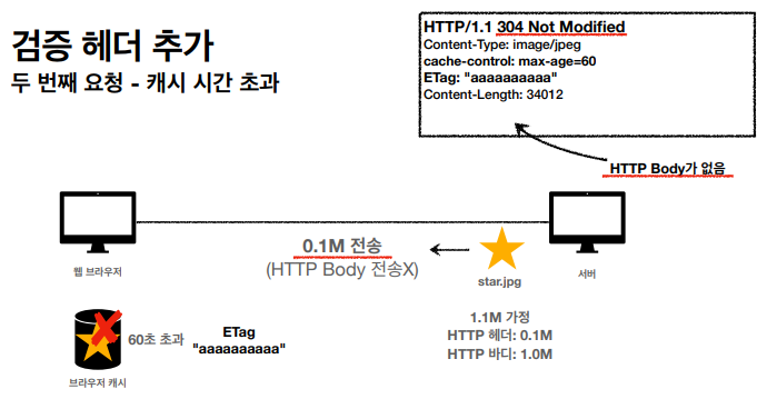 캐시 만료 후에도 서버에서 데이터가 변경되지 않았다면, 데이터를 전송하는 대신 저장해 두었던 캐시를 재사용하면 된다.