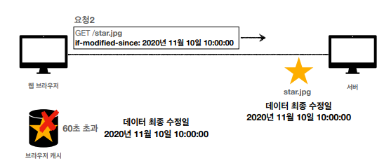 이때 요청 메시지에 if-modified-since 조건부 요청 헤더를 넣어 캐시가 가지고 있는 데이터의 최종 수정일 담아 전송하게 된다.