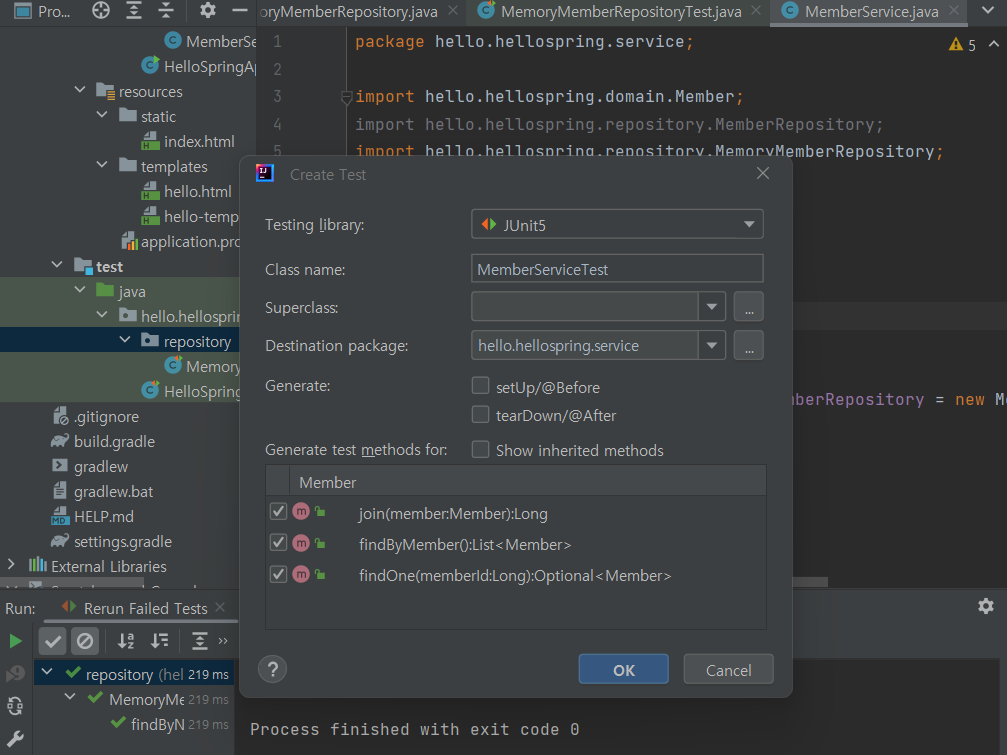 Test -> MemoryMemberRepositoryTest 클래스 만들기